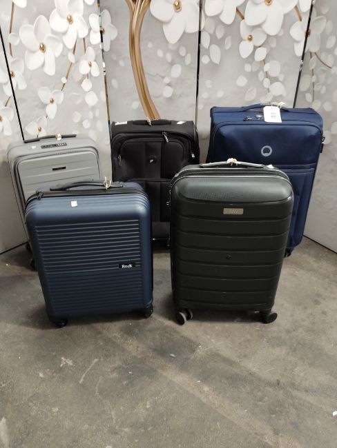 Five pre-owned wheeled suitcases to include Delsey x 2, Rock Hard shell x 3.