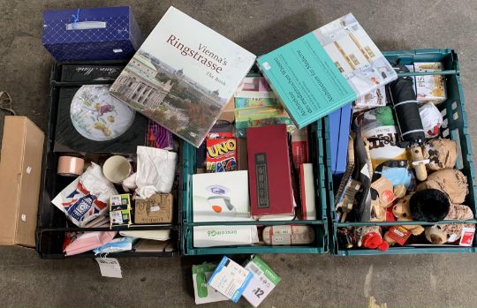 Three crates of new assorted items to include souvenirs, household toys and related.