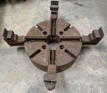 Pre-owned adjustable four-jaw lathe chuck - full diameter size open 45cm x 45cm approximately.
