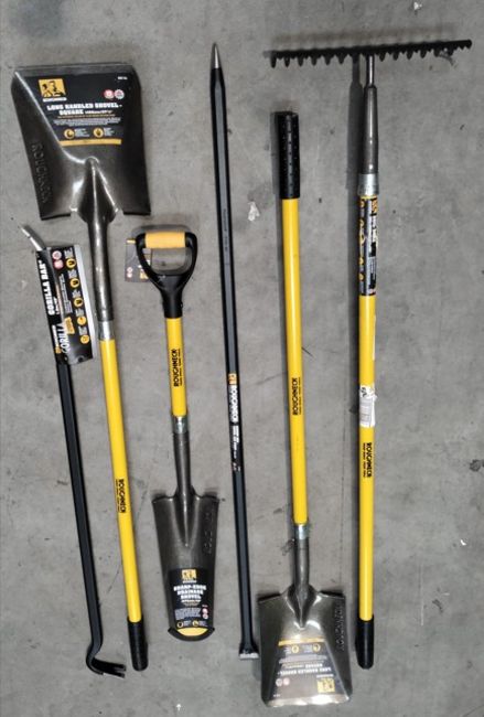 Six assorted Roughneck related items; 1.2m gorilla bar, two 146cm long handled shovel square, sharp-edge drainage shovel, 35 x 150cm sharp-edge soil rake and a1.52m digging bar chisel and point.