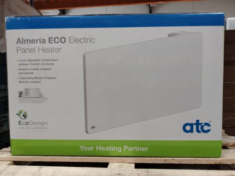 As new ATC Almeria ECO electric panel heater,1500w, digital TFT display, IP24, white, H 440 x W 680 x D 100 (depth with bracket 103mm) boxed (DPH1500-ECO2).