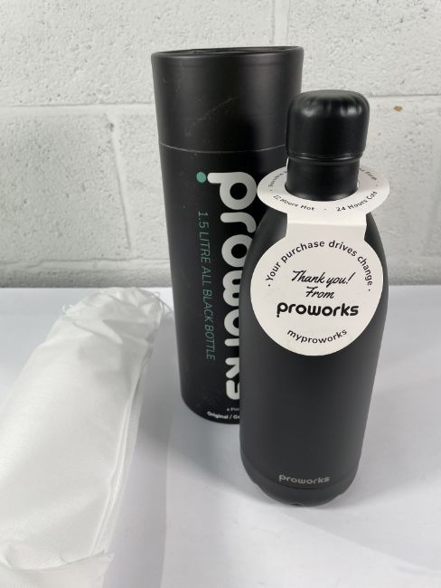 Five as new Proworks PW-1000-Z767 stainless steel 1.5ltr water bottles - black.