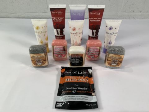 Twelve as new Sea of life products - night cream 50ml, eye cream 50ml, mud mask 100ml, 2 x aftershave balm 100ml, moisturizing cream, dead sea mud pro 100gr, 2 x mud soaps, 2 x pomegranate soaps and a salt soap bar.