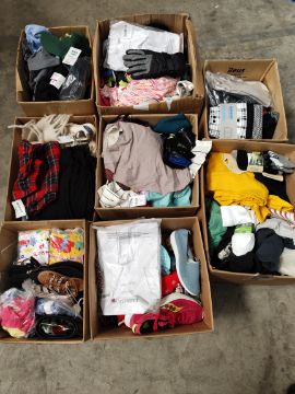 Eight boxes of assorted as new clothing to include jumpers, T-shirts, shorts, underwear and related.