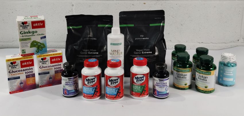 Sixteen assorted supplements and protein powders - Proteinworks Mass Gainer Extreme, Lifetake Mind Master, Vitammies Biotin gummies and Movefree joint health (expired dates within 6 months).