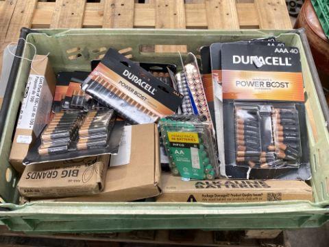 A crate of assorted batteries to include Duracell and Energizer (Approximately 400).