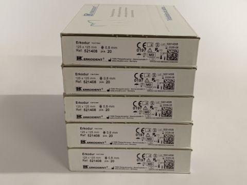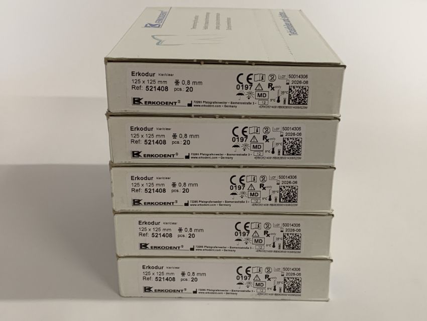 Five boxes of as new Erkodent Erkodur thermoforming foil and discs, (REF: 521408, EXP: 2026/06, 20 pcs per box).