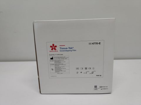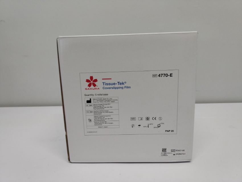 A box of Sakura Tissue-Tek coverslipping film (Five rolls in a box, REF: 4770-E, EXP: 2026-07-31).