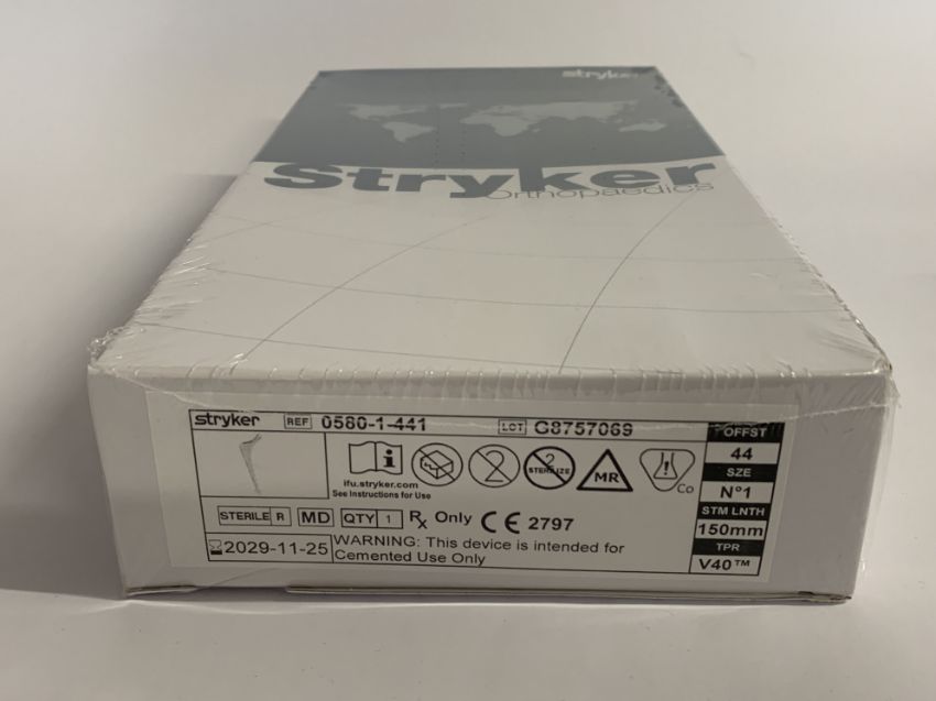 As new Stryker Exeter V40 Cemented Hip Stem, Stainless Steel 2 PMMA, Offset 44, Size N°1, STM Length 150mm, REF: 0580-1-1441 (EXP: 2029-11-25).