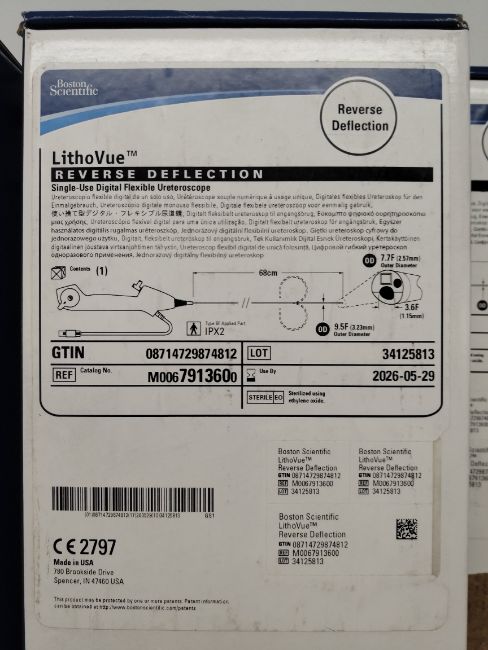 Four as new Boston Scientific LithoVue single-use digital flexible Ureteroscope, 7.7F (REF: 791360 / M0067913600, EXP: 2026-05-29).