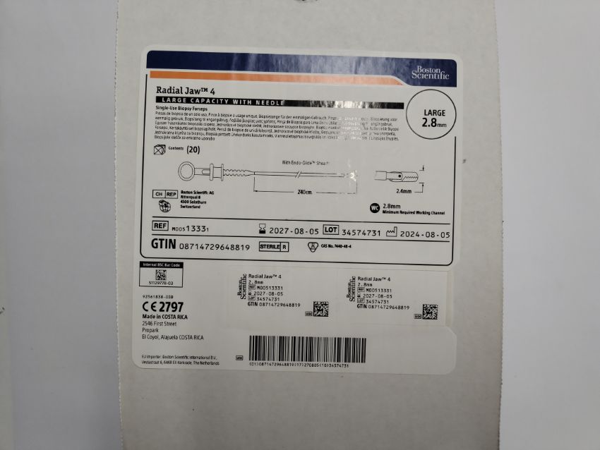 Four boxes of Boston Scientific Radial Jaw 4, single use Biopsy Forceps, large capacity with needle, large, 2.8mm (REF: M00513331, EXP: 2027/08/05, 20 per box).
