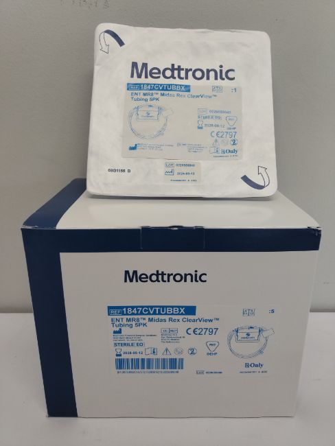 An as new box of Medtronic ENT MR8 Midas Rex Clearview tubing 5pk (REF: 11847CVTUBBX, EXP: 2028-09-12).