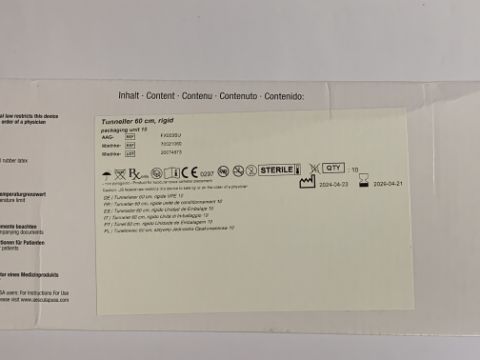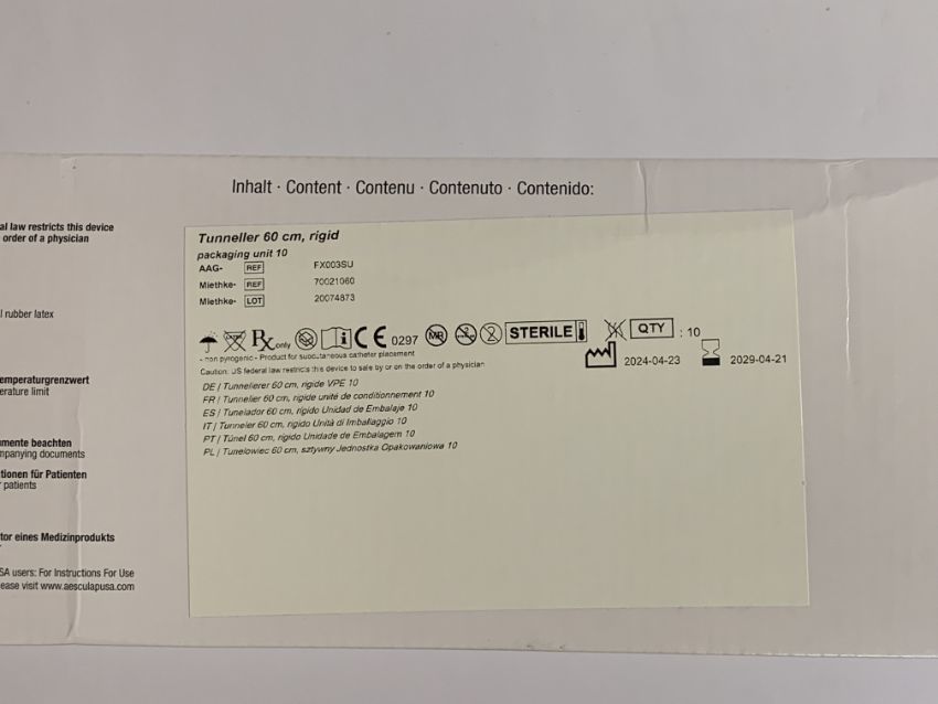An as new B Braun MIETHKE Tunneller 60cm, rigid (REF: FX003SU, EXP: 2029/04/21, pack of 10).