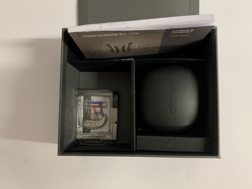 An as new Oticon Real 3 Minirite R C090 (single) with charger case and pro wax.