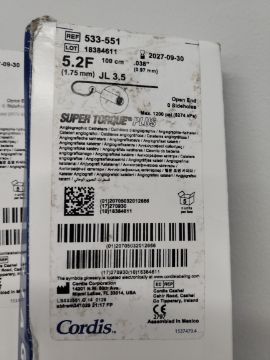 Six as new Cordis Super Torque plus angiographic catheters, open end, 0 sideholes, max. 1200 psi. Boxes damaged (REF: 533-551, EXP: 2027-09-30).