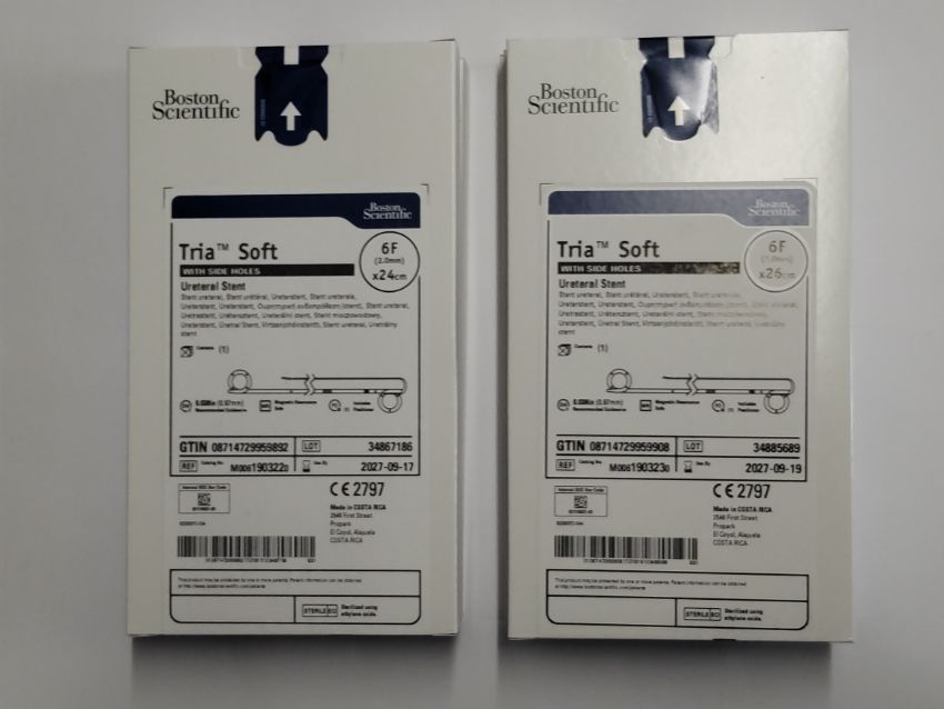 Six as new Boston Scientific Tria Soft Ureteral Stents; 3x 6F (2.0mm) x 26cm (REF: M0061903230, EXP: 2027/09/19), 3x 6F (2.0mm) x 24cm (REF: M0061903220, EXP: 2027/09/17).