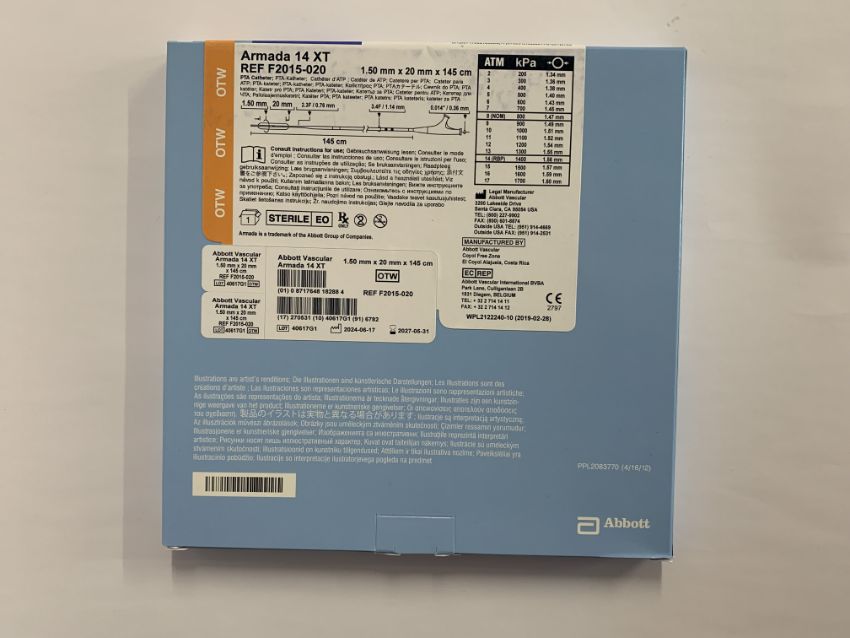 An as new Abbott Armada 14 XT PTA Catheter 1.50mm x 20mm x 145cm, (REF: F2015-020, EXP: 2027/05/31)
