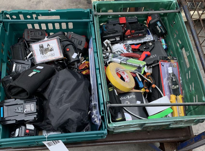 Two crates of as new and pre-owned hand and power tools to include Bosch 18v Li-ion battery, Wera tool kit, Bluespot 9-piece 1/2" metric deep socket set and 2023 Hoater full body fall arrest harness HT-315 M-L.