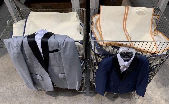 Approximately forty BB-BOUM formal suit jackets, shirts and bow/tie sets, various sizes in protective zip bags.