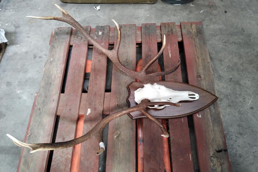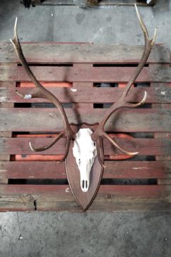 A deer skull antlers head mounted on wooden plaque.