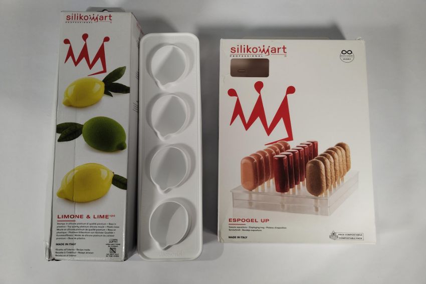 Seven as new Silikomart products; 3x Limone & Lime 120 cooking moulds (8051085303588) and 4x Espogel Up Cake display trays (8051085241521).