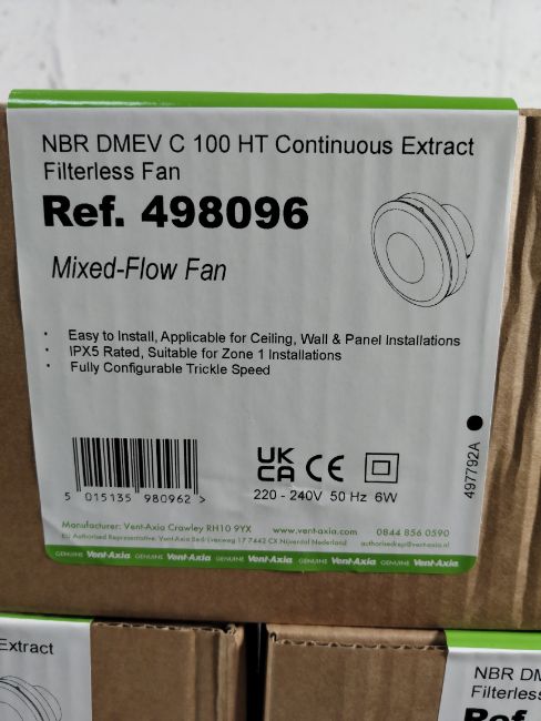 Five Vent-Axia lo-carbon NBR DMEV C HT Continuous Extractor filterless mixed flow fans, IPX5, fully configurable trickle speed, sealed boxes (498096).