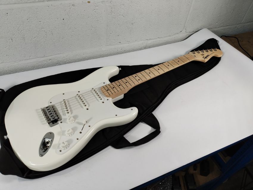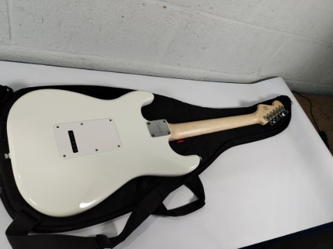 A pre-owned Squier Sonic Stratocaster HT MN - Arctic White with Fender gig bag.