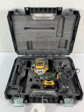 A pre-owned Dewalt laser 3 line laser level DCE89G (item has a smashed glass protector on vertical laser, sold as seen).