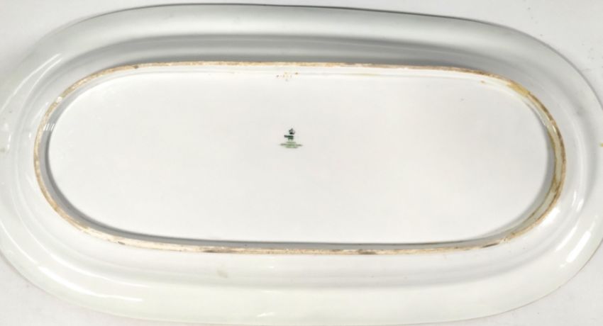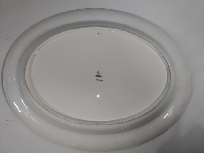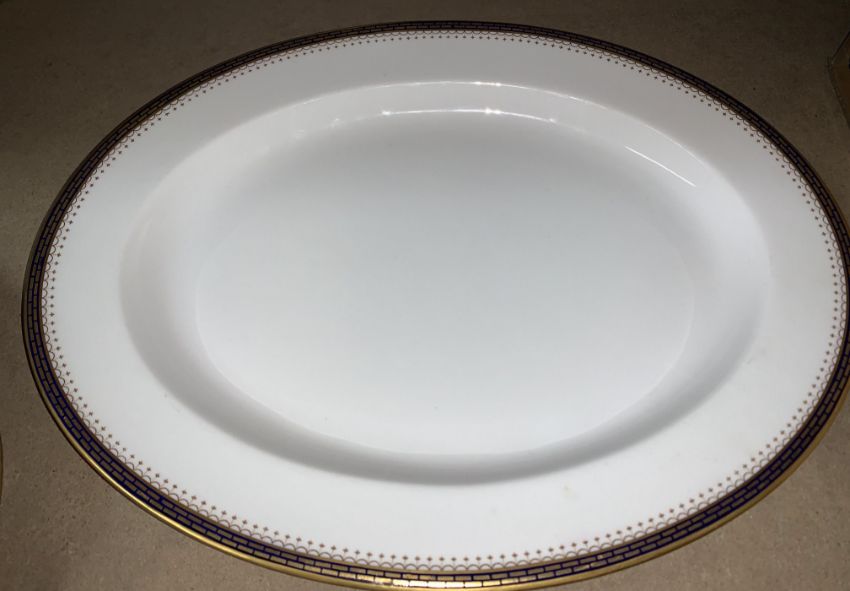Two pre-owned vintage T.Goode & Co London, Spode Copelands platter/plates - both with blue and gold patterned edge designs - plate sizes: 56 x 28cm, some damage to underside and a 40 x 52cm, both plates stamped.