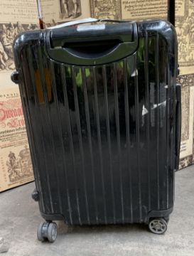 A pre-owned Rimowa Salsa Deluxe hard case wheeled suitcase with some knocks and scratches.