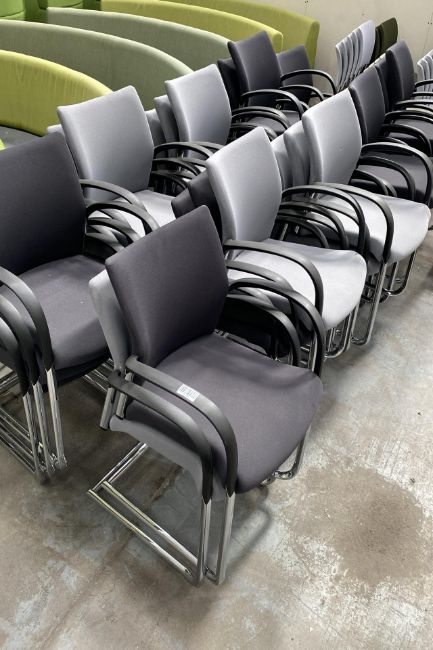 Twenty nine stackable chairs with arm rests.