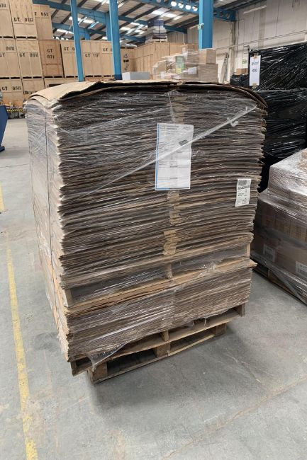 A pallet containing Deflecto sit stand mats (CM24442FBLKSS).