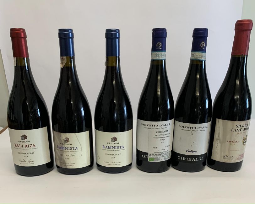 Two Kir-Yianni Ramnista Xinomavro 2019 red wine 2 x 750ml (label distressed), two Giribaldi Dolcetto D'Alba Calupo 2019 red wine 2 x 750ml, Sierra Cantabria Garnacha 2019 Rioja red wine 750ml (label distressed) and a Kir-Yianni Kali Riza Xinomavro 2019 red wine 750ml.