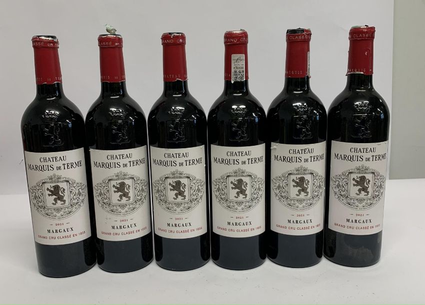 Six Chateux Marquis De Terme 2021 Margaux Grand Cru Classe En 1855 red wine 6 x 750ml (foil tops slightly damaged).
