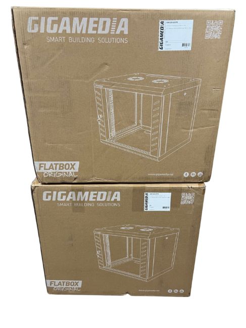 Two as new Gigamedia 19'' Wall Mount Cabinets With Sides Access Flatboxes 6U 600mm W (M/N: GGM COF6U5FPN).