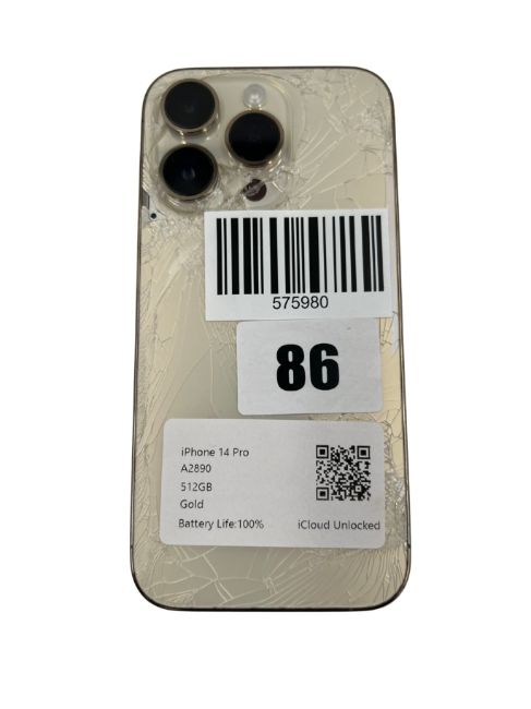 Pre-owned Apple iPhone 14 Pro A2890 512GB in Gold (iCloud unlocked. Rear glass damaged) (Battery health: 100%) (IMEI: 356901451150964 S/N: HCFQM40Q34 ).