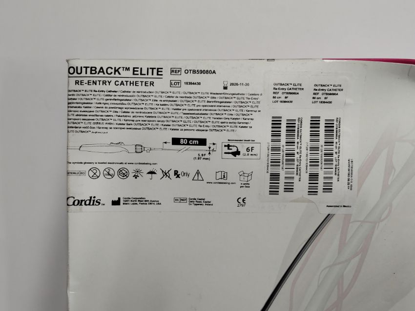 An as new Cordis Outback Elite Re-Entry Catheter, 80cm, 6F (REF: OTB59080A, EXP: 2026/11/30).