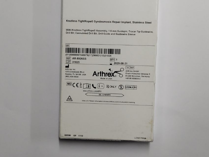 An as new Arthex Knotless Tightrope Syndesmosis Repair Implant, Stainless Steel (REF: AR8926SS, EXP; 2029/08/31)