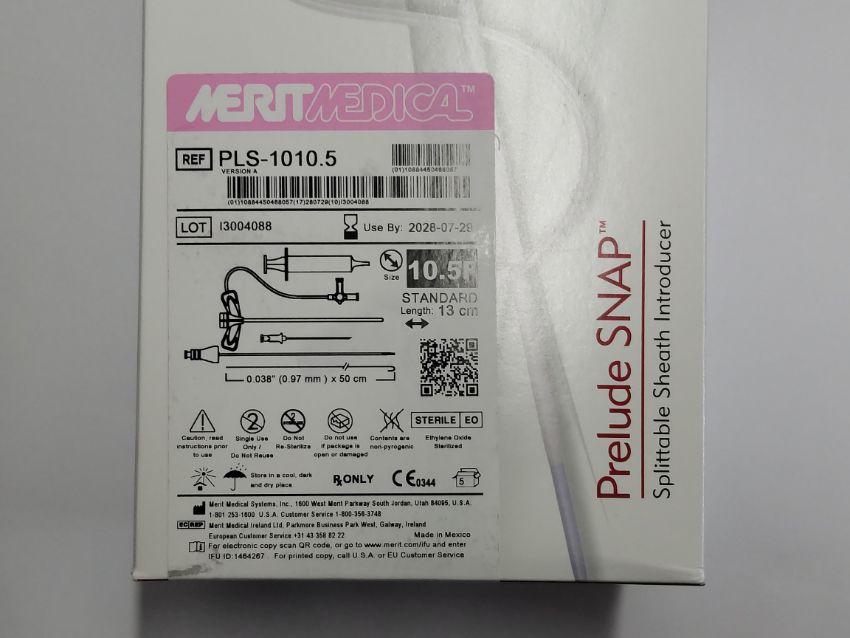 An as new Merit Medical Prelude SNAP Splittable Sheath Introducer, 10.5F Standard, Length, 13cm, (REF: PLS-1010.5, EXP: 2028/07/29).