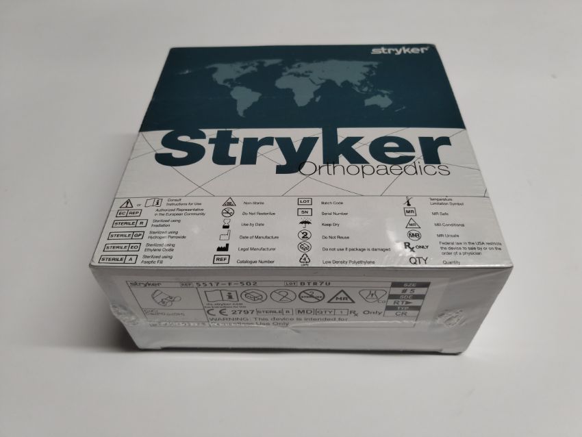 An as new Stryker Triathlon Cruciate Retaining Femoral Right, Beaded with PA, Cementless use only, Size: #5, Side: Right, Type: CR (REF: 5517-F502, EXP: 2030/02/13).