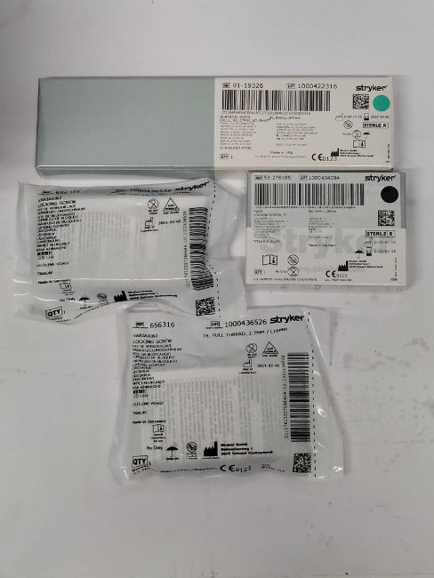 A large quantity of assorted Stryker screws, drills and related to include 15x hand drill, WL 27mm, AO-Shaft (REF: 91-14326), 100x hand locking screw, T7 (REF: 53-27620S), 20x Variax 2 locking screw (REF: 656312S), 4x Variax ankle distal lateral fibula plate, 7 hole (REF: 40-20907S), 20x hand locking screw, T7 (REF: 53-27616S), 20x hand locking screw, T7 (REF: 53-27618S).