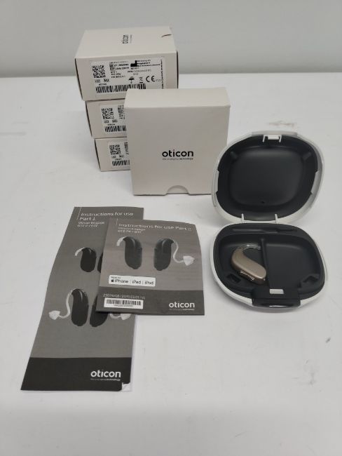 Four as new Oticon Engage BTE hearing aids in beige, white case.