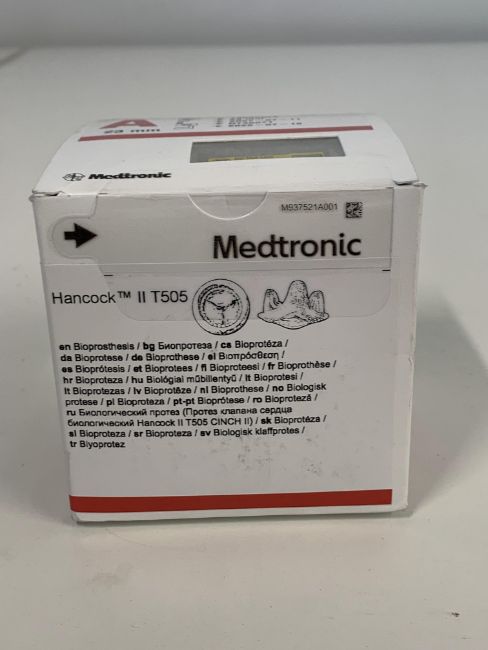 As new Medtronic Hancock II T505 bioprosthesis for heart valve replacement, Ø 23 mm (REF: T505C223, EXP: 2027-07-11).