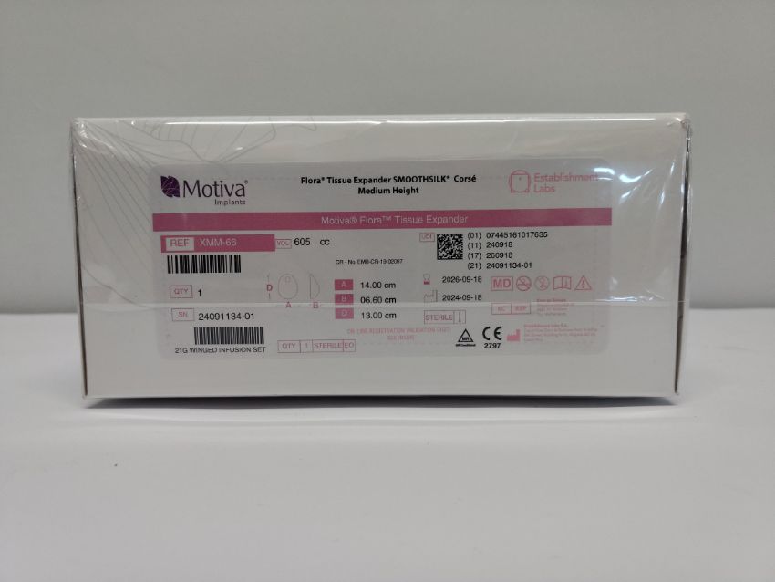 An as new Motiva Implants Flora tissue expander SMOOTHSILK corse medium height (REF: XMM-66, EXP 2026-09-18).