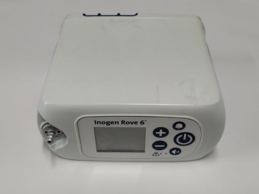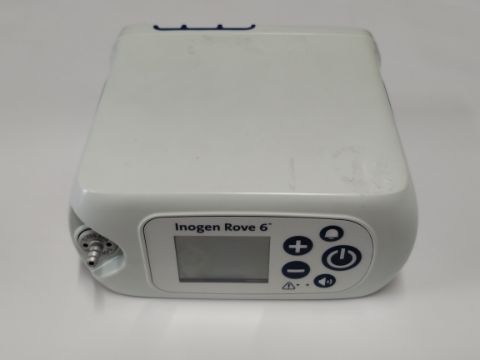 A pre-owned Inogen Rove 6 Portable Oxygen Concentrator with rechargeable battery, charger and carry bag. Input: 12.4-15.1 VDC, 24 VDC-120W, Output: 90% Oxygen, IP22 (REF: IO-501) UK adaptor required.