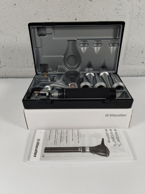 An as new Riester 3.5v xenon otoscope with C-handle, comes with two lithium batteries (REF: 3860).
