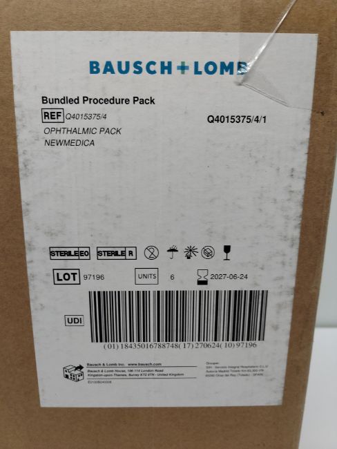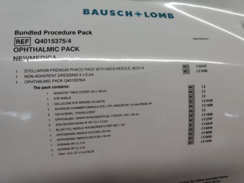 Six as new Bausch and Lomb bundled procedure packs. Each pack contains 1x Stellaris premium phaco pack with mics needle (REF: BL5114), 1x ophthalmic pack (REF: Q4015376/4) and 1x Non-adherent dressing 5x5cm (EXP: 2027-06-24).