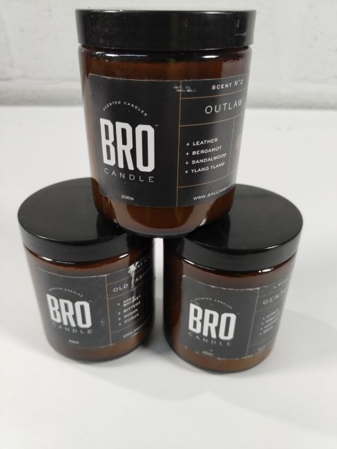 Three Bro candle sets for men, 200g jars, natural scented soy wax candles, 40-50 hour burn time, labels may have slight marks (one scent No1 Gentleman, one scent No2 Outlaw and one scent No4 Old Fashioned).