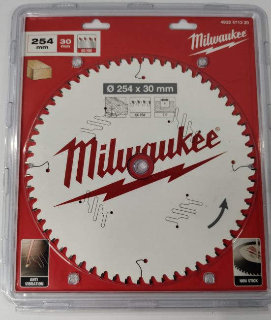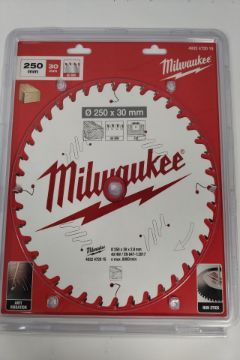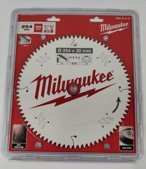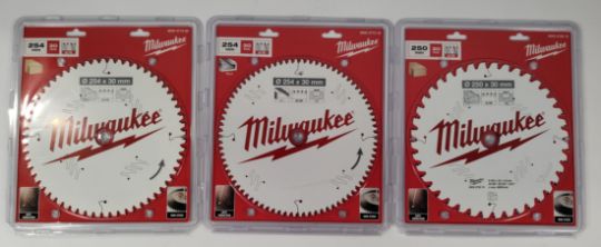 Three assorted as new Milwaukee circular blades - one 254 x 30 x 3.0mm 60HW Wood (4932471320), one 254 x 30 x 3.0mm 80HW Alu (4932471318) and one 250 x 30 x 2.8mm 40HW wood (4932472015).