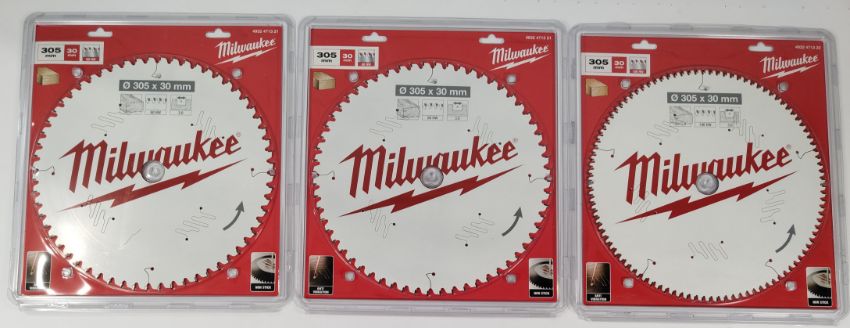 Three assorted as new Milwaukee circular blades - Two 305 x 30 x 3.0mm 60HW (4932471321) and one 305 x 30 x 3.0mm 100HW (4932471322).